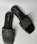 Add a touch of elegance and sophistication to your look with the Midnight Bloom Embellished Slides. Designed in a classic black shade, these slides feature a beautifully detailed floral beadwork pattern that creates a bold yet graceful statement.